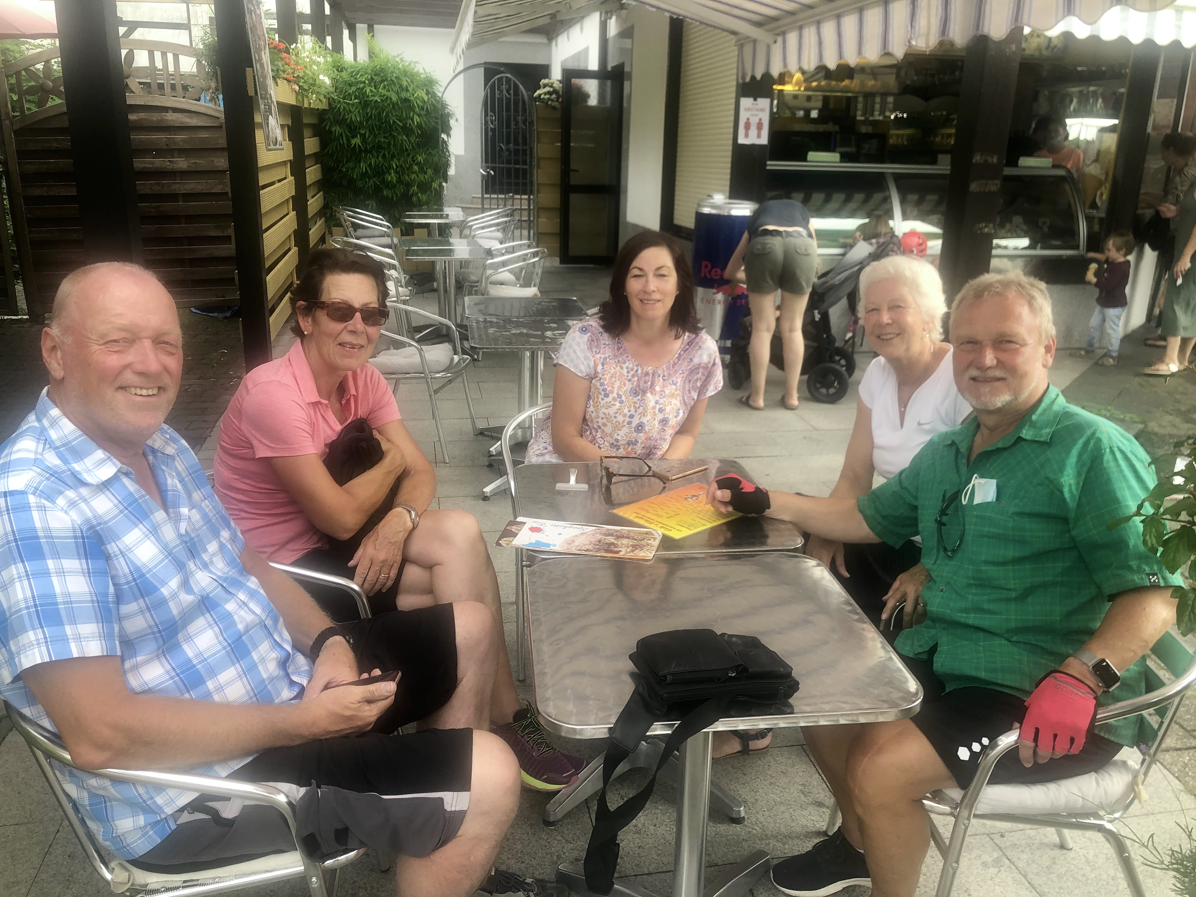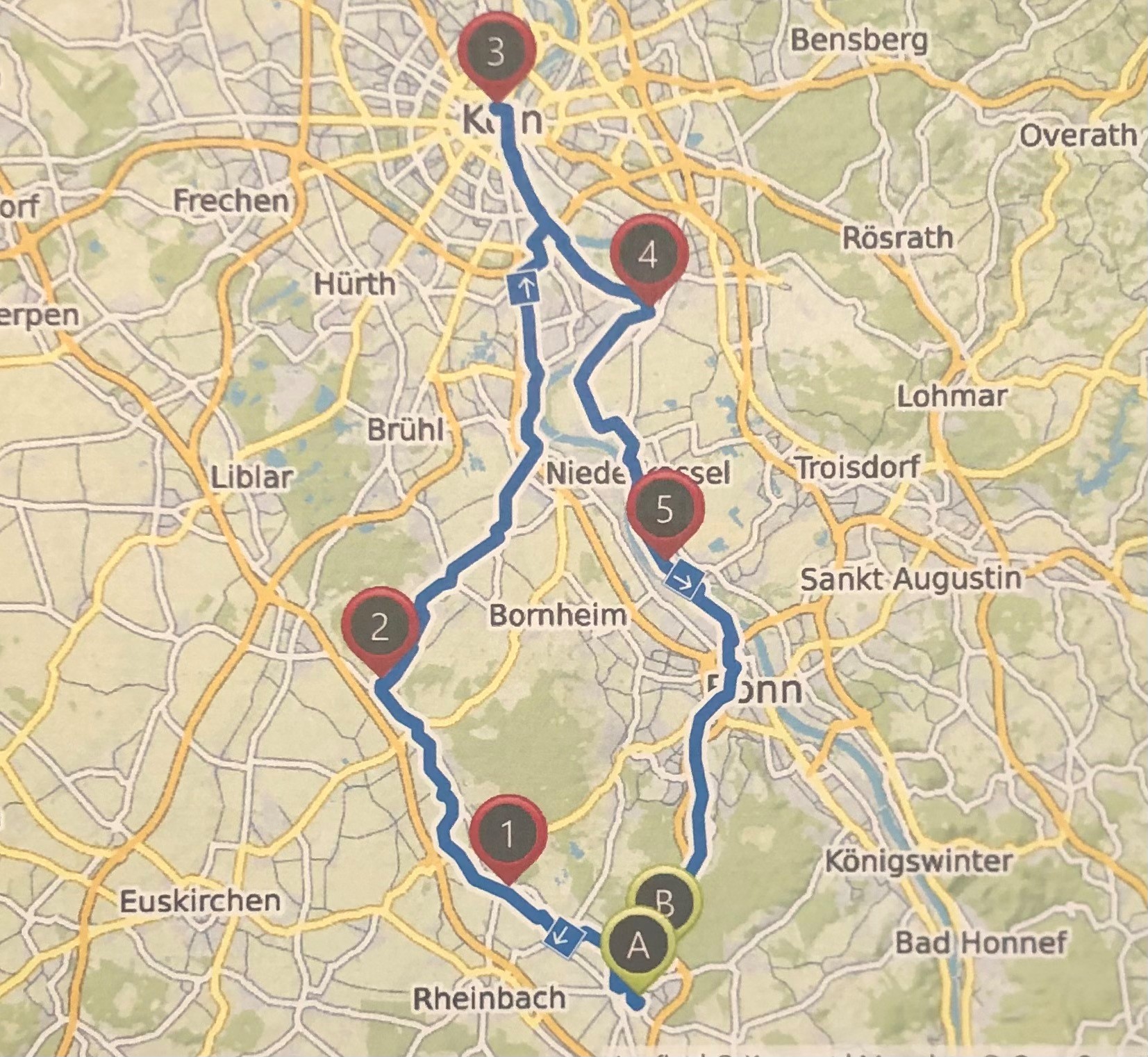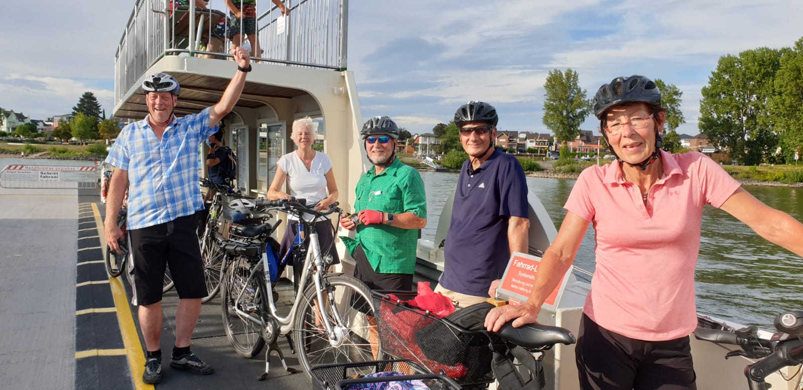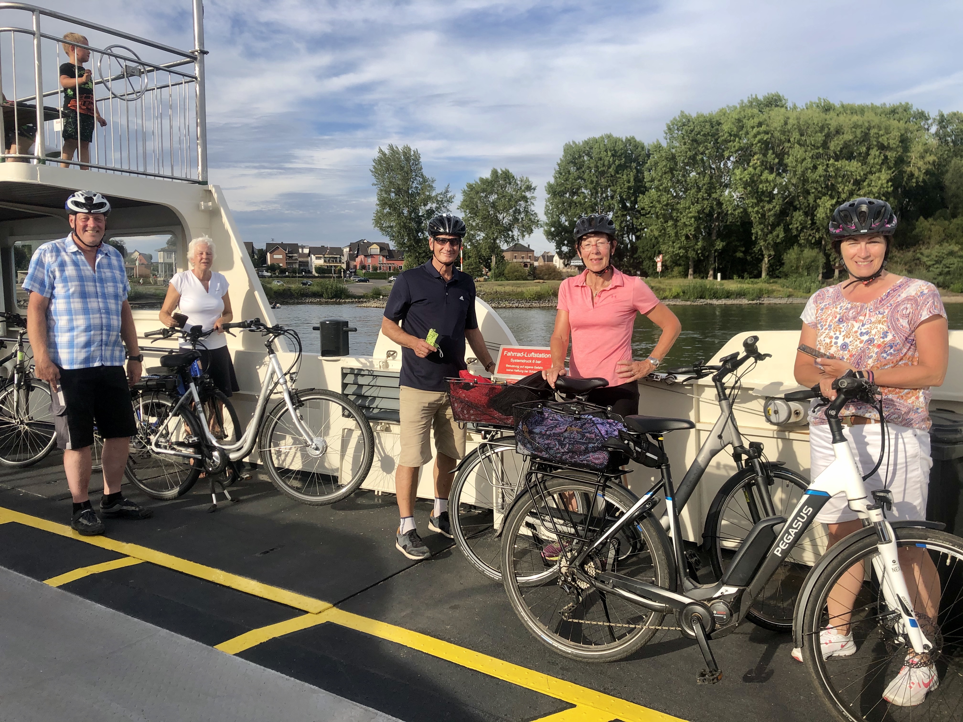 Nachdem der Rhein überquert wurde, folgte der landschaftlich schönere Rückweg rechtsrheinisch überwiegend direkt am Fluss. In Mondorf überquerten wir per Fähre den Rhein und im Biergarten Schänzchen nahe der Beethovenhalle stärkten wir uns für die letzten Kilometer.