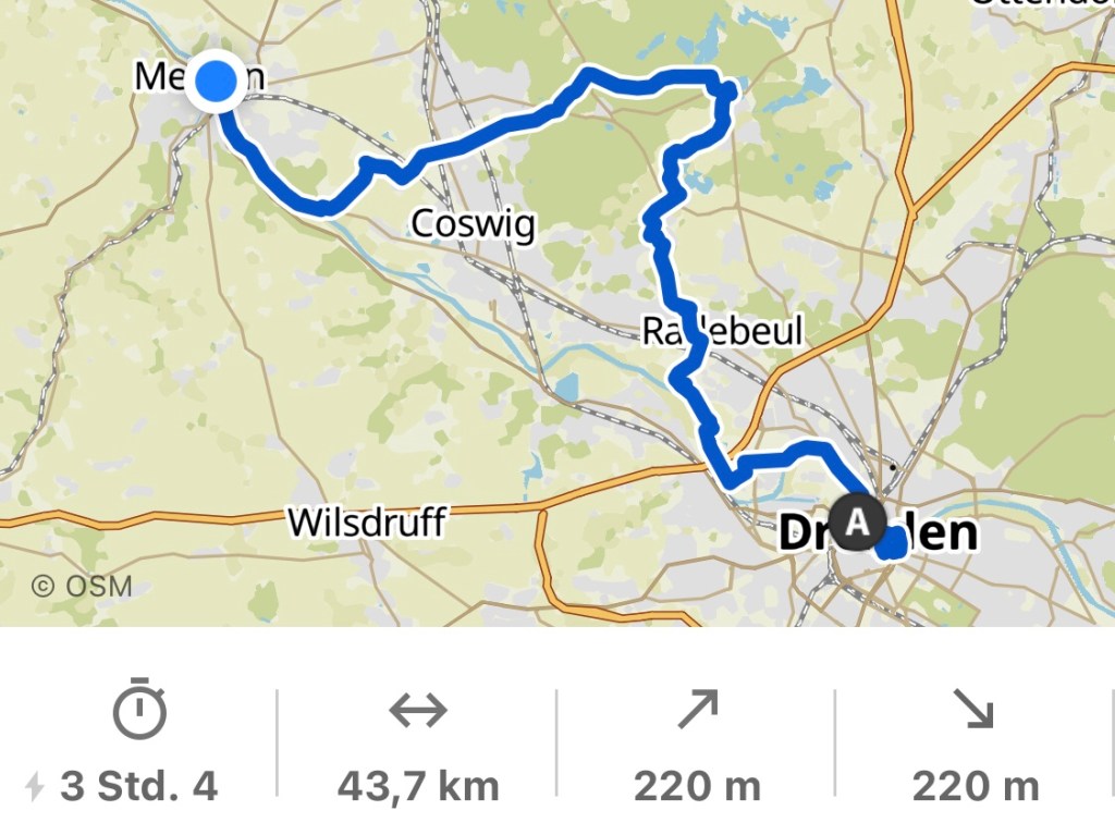 anfangs an der Elbe entlang. Dann ging es in die Weinberge bei Radebeul bis zum Schloss Moritzburg. Zurück ans Elbufer und weiter bis nach Meißen.